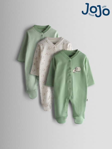 JoJo Maman Bébé Green Sheep Cotton Footed 3 Pack Sleepsuit
